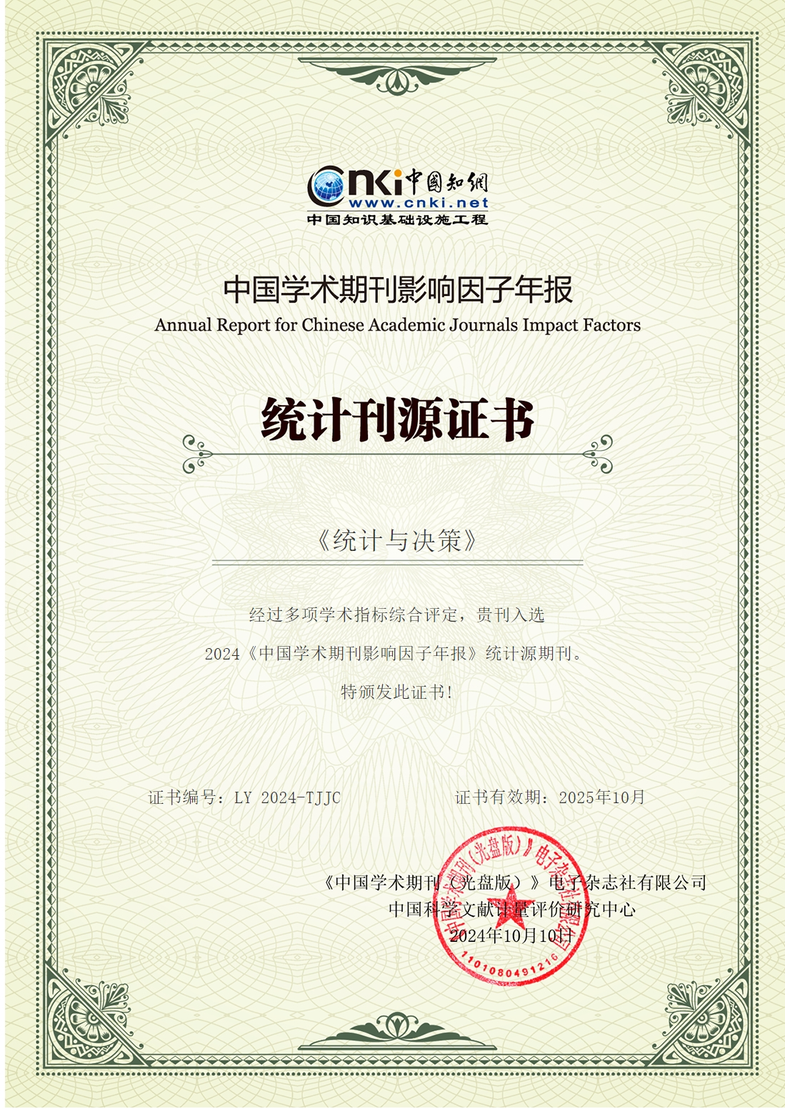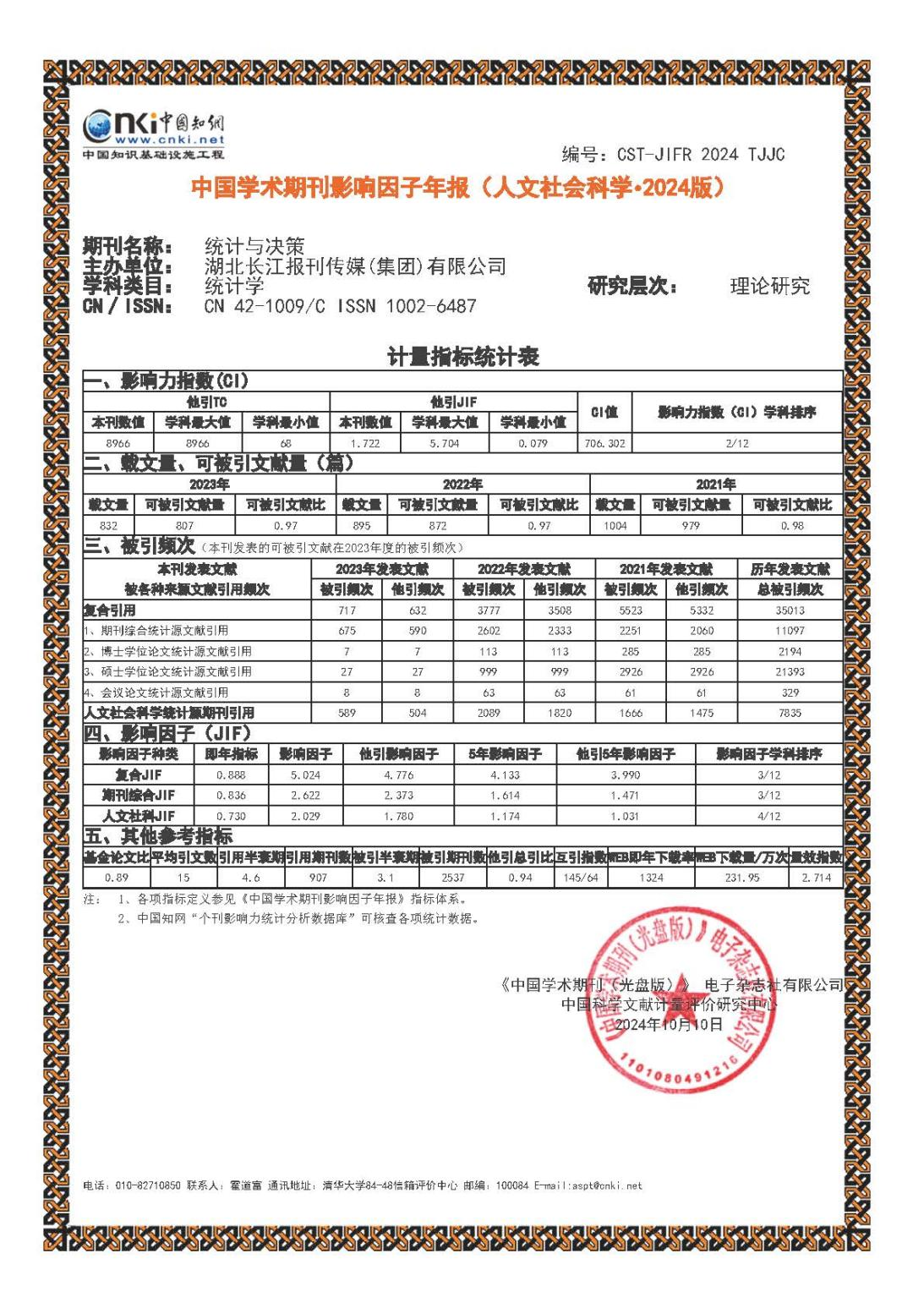 近日,《中国学术期刊(光盘版)》电子杂志社有限公司、中国科学文献计量评价研究中心发布了《中国学术期刊影响因子年报(人文社会科学·2024版)》。发布的数据显示,由长江出版传媒股份有限公司主管的《统计与决策》杂志各项计量指标均创新高,复合影响因子达到5.024,较上一年度3.912上升28.43%;综合影响因子为2.622,较上一年上升36.63%;即年指标、总下载频次、Web下载率等指标均有显著提升,影响力指数(CI)达到706.302,位列统计学期刊Q1区,排名第二位。